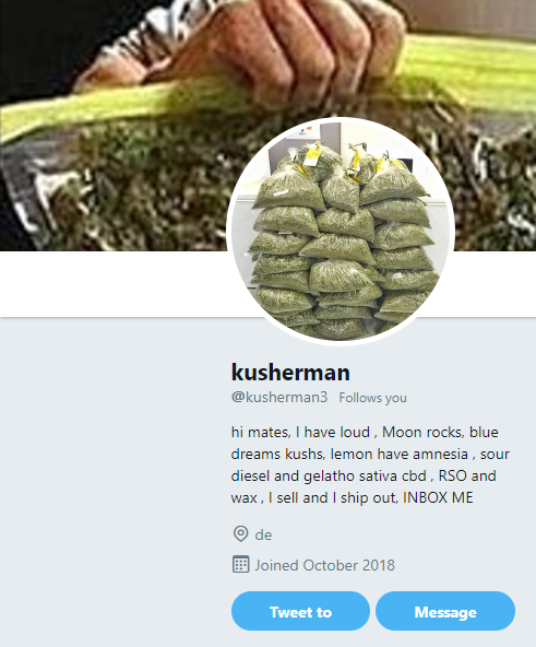 Maybe inside the US, but outside the US too? Cops don’t have that sort of jurisdiction. @kusherman has to be legit. Has to be. Plus he’s got almost seven hundred Twitter followers. There’s no way 700 of Vladimir Putin’s Twitter trolls have been duped by @kusherman3. This has to be a safe and legit marijuana delivery service in and out of the USA. There’s no other explanation.