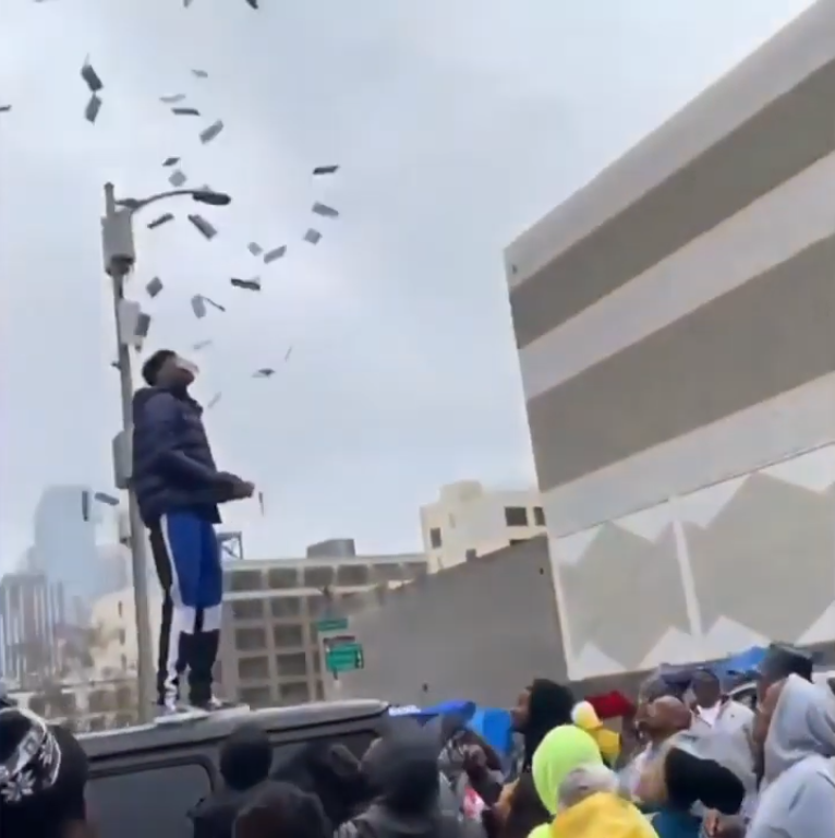 This is just a guess but I don’t think this is what Nipsey had in mind when he said you should give back to the community. Standing on top of your Mercedes while throwing cash at a bunch of drug addicts doesn’t seem like the best way to help out. It seems kind of degrading, to be honest. Maybe next time you could just volunteer your time at a food bank or give out toys to poor families. That seems more like the not completely childish thing to do.