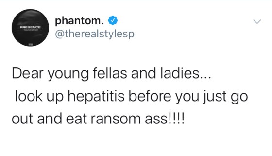 Dear young fellas and ladies… look up hepatitis before you just go out and eat ransom ass!!!! — phantom. (@therealstylesp) … More